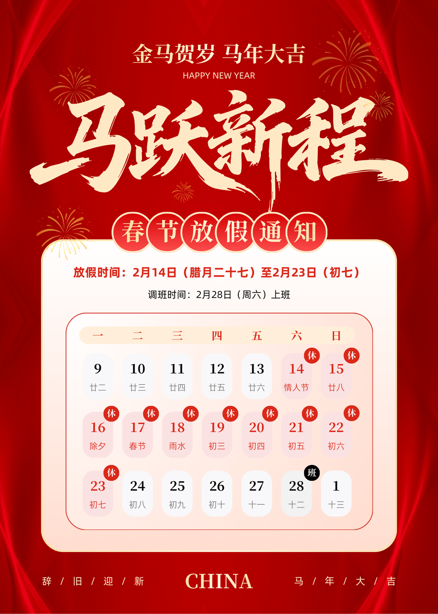 调班安排:2026年2月28日(周六)正常上班,补调春节假期。